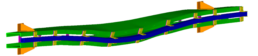 Era necessário garantir que não ocorressem modos de flambagem prematuros, que descaracterizassem o comportamento global e unificado dos perfis. A simulação permitiu validar que o conjunto apresentava comportamento esperado para o arranjo estrutural projetado: